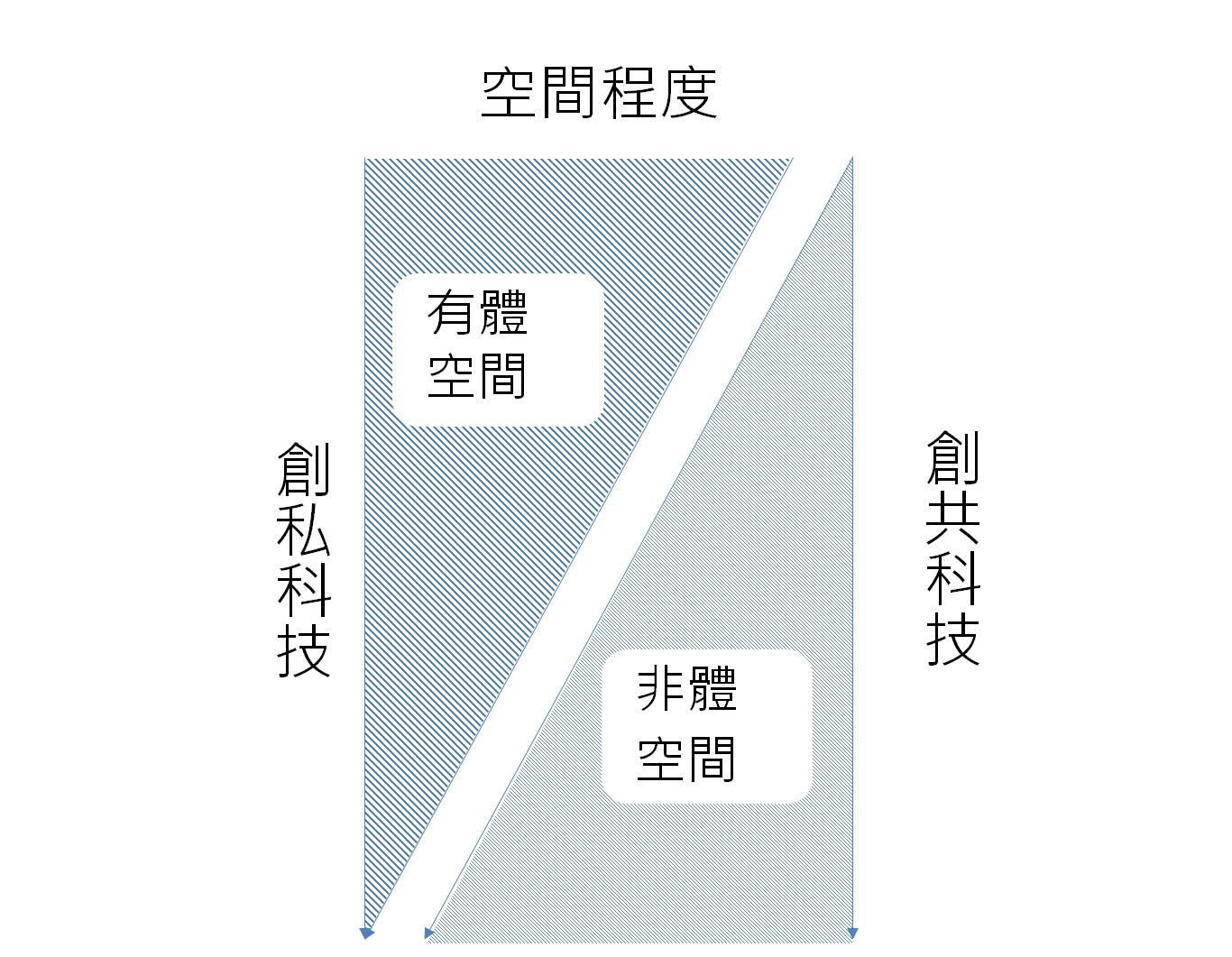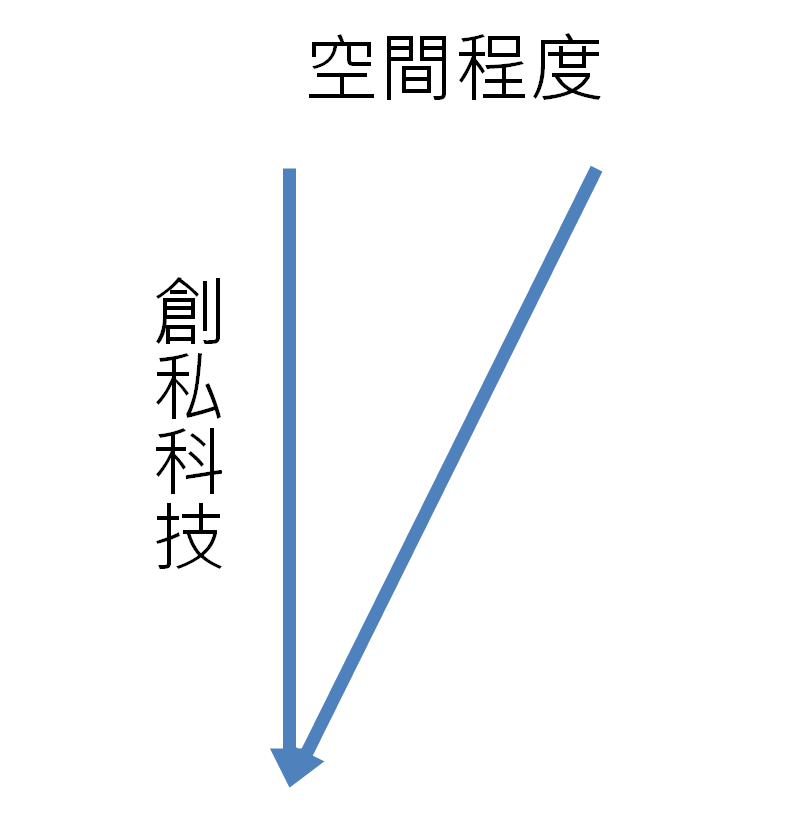 於是,我們現代人擁有一種雙重生活:一方面,隨著創私科技的發展,需要身體才能運作的空間(有體空間)越來越小,我們過著一切以個人為出發點的生活,但另一方面,創共科技也在發展,不需身體就能運作的空間(非體空間)越來越大,讓我們似乎又過著非常融入群體的生活。就此,我們可以幫上面那張圖補上另一半: